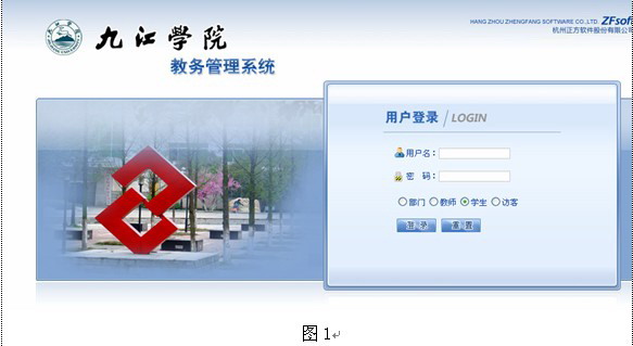 正常情况下会出现 “九江学院正方现代教学管理信息系统——WEB服务管理子系统”页面(如图1),输入用户名(校园卡前11位)和密码,并且选择用户权限为学生,最后点击【登录】按钮。