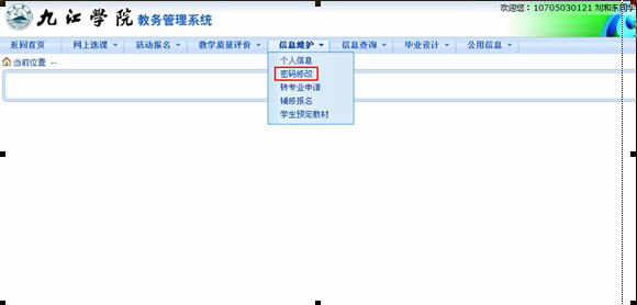 1.进入九江学院主页->快速导航->教务系统。输入用户名(即校园卡前11位数字)及个人密码(初始密码为校园卡前11位数字)。为避免他人恶意篡改密码,造成选课困难,学生进入系统后务必在信息维护中及时更改初始密码。