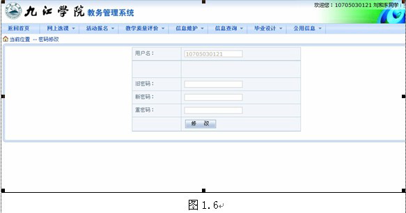 在“WEB服务管理子系统学生功能”界面下选择 信息维护—>密码修改进入学生密码修改界面(图1.6)。需要输入旧密码,然后按要求将新密码输入两遍,最后点击【修改】按钮确认修改。