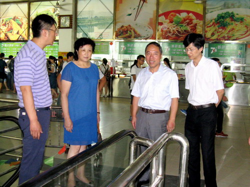 甘校长一行首先对三食堂手动扶梯的设备运行情况进行了检查,接着逐层对食堂的饭菜质量、花色品种等方面进行全面检查。甘校长认真听取了饮食中心主任蔡飞关于食品卫生、安全管理、开学迎新各方面情况的汇报,并在三楼与学生一起用中餐。就餐过程中,甘校长与同学进行了交流,就学生关心的饭菜价格、品种口味等方面征求了学生的意见及建议。