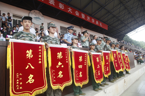 大会会场雄伟壮观,鲜艳的红旗在队前飘扬,雄壮的军歌在空中回荡。“军纪如铁,意志如钢,严格要求,勇争第一”、“激情飞扬,超越梦想、挑战极限、铸就辉煌”等大幅标语悬挂在田径运动场周围,94个排列整齐、精神抖擞的学生方队,迎着朝阳、激情满怀地等待着校领导和九江军分区首长的检阅。校领导甘筱青、吴桃娥、纪岗昌、王万山、陶春元、杨焱林,魏立平、杨耀防、九江军分区政委汪开华大校、九江军分区参谋长封志宏大校、空军场站参谋长张武中校及学校各二级学院党政负责人和有关部门负责人出席了大会。副校长王万山主持了2015级新生军训表彰大会。