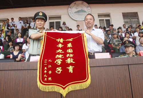 凯歌扬军威,健步抒豪情。金风送爽,丹桂飘香。初秋时节,九江学院洋溢着青春和喜庆的气息,2015级新生为期9天艰苦紧张的军训即将落下帷幕。9月16日上午,2015级新生军训总结表彰大会暨开学典礼分别在主校区和浔东校区隆重举行。