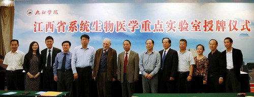 10月16日上午,江西省系统生物医学重点实验室授牌仪式在九江宾馆隆重举行,九江学院校长甘筱青致辞,副校长纪岗昌主持授牌仪式。省科技厅副厅长赵金城、省科技厅条财处副处长卢荣,九江市科技局局长李文豪、副局长汪季焜及计划科科长万小平、九江学院校科研处、实验中心和医学部一部四院负责人出席了仪式。参加仪式的还有美国科学院院士、耶鲁大学斯特林(Sterling Professor)教授、美国国家人类基因组计划发起人之一Sherman Weissman先生、耶鲁大学医学院遗传系研究员、单细胞功能基因组学技术国际前沿专家潘星华博士、美国国立卫生研究院研究员、教育部心血管重大疾病防治协同创新中心特聘客座教授和首席科学家蔡涛博士、美国国立卫生研究院研究员,美国SAIC-Frederick公司科研团队负责人喻萍博士、教育部“长江学者”奖励计划特聘教授、国家杰出青年基金获得者、南开大学杰出教授刘林博士等知名专家。