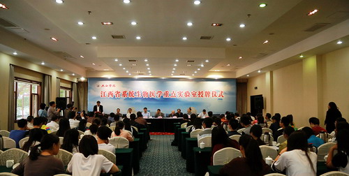江西省系统生物医学重点实验室主任李卫东教授作建设总结报告,就研究水平和创新能力、队伍建设、实验条件、运行管理和开放交流等方面对实验室建设发展情况做了汇报。嘉宾代表、耶鲁大学潘星华博士致辞,祝贺江西省系统生物医学重点实验室正式授牌,并代表Weissman教授表示将一如既往地支持实验室的工作。