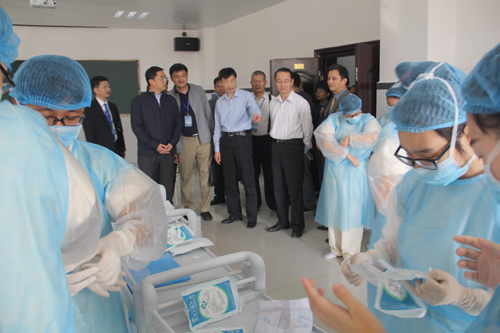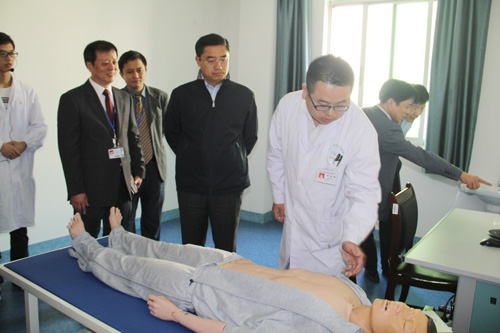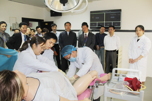 紧接着,专家组分别对医学技能训练与考核中心、临床实验教学中心、教学楼、重点科室、医学科研中心等处进行了实地走访和教学观摩。在焕然一新、改造升级的临床实验教学中心,专家组成员在陶副校长、临床医学院/附属医院党政领导的陪同下,考察了显微互动实验室、标准化实验室、影像诊断实验室、模拟产房、多功能中央监控室、模拟ICU和外科实验室等,重点观摩了高级产妇综合模拟人自然分娩,外科消毒铺巾、洗手穿衣,影像读片等实验项目,对ICU实验室的高端智能综合模拟人进行了了解,对中央监控室的功能进行了考察。实验中心门类齐全、设备先进、功能完备、环境整洁,各实验带教老师讲解全面,得到了专家的好评。