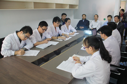 在住院病房,专家组参观了产科示教室,走访了省级重点学科消化内科,与正在开展教学查房的老师和实习生面对面交谈,对实习生轮科计划、出科考核、完整病例书写、社区实习等情况进行了详细的了解。专家组还现场观摩了神经内科聂红兵主任主持的病例讨论,师生互动活跃,问题探讨深入,教与学的效果充分体现。考察中,专家组同时就学院师资队伍建设、教学管理、学生培养、实习考核和教学设备等情况与陶副校长、张院长、教学管理科、教研室等相关人员进行了愉快的交流。