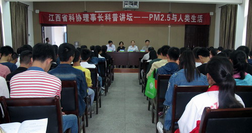10月23日下午,由江西省科学技术协会、江西省环境保护厅主办,江西省环境科学学会承办,九江学院化环学院协办的江西省科协2015年理事长科普讲坛在向学楼201报告厅隆重举行,本次讲坛的主题是PM2.5与人类生活。我校纪岗昌副校长、江西省科学技术协会学会部部长黄丽芬、江西省环境保护厅科标处调研员王俊华、江西省环境监测中心站站长邹新在主席台就坐,来自江西省环境科学学会、南昌大学、东华理工大学、九江环境监测站及我校化环学院、科研处、鄱阳湖生态经济研究中心的领导、专家与百余名同学一道出席了本次讲坛。开幕式由江西省环境监测中心站站长邹新主持。