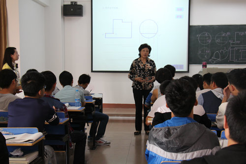 10月26日上午,吴桃娥副校长来到竞知楼415教室,与机材学院B1551/B1552班同学一起听取了周玉华老师讲授的《机械制图》课程。机材学院党委副书记陈胜才、副院长王英惠一同听课。