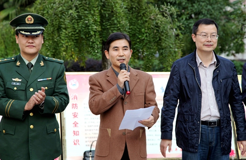 在第二十五个“119”消防宣传日的到来之际,11月4日下午,我校2015年119消防宣传月启动仪式在向学广场举行。校纪委书记魏立平、庐山区消防大队参谋邓雨欣,校保卫处、学生处、文传学院、理学院、会计学院、化环学院等部门负责人及学生代表约400余人参加了此次消防宣传及运用消防器材进行灭火的演练活动。