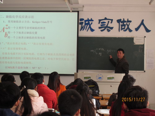 课堂上,王春风老师围绕着缺陷化学的知识,运用生活中宝石的实例深入浅出的讲解了缺陷化学产生的原因、类型、反应表示法、内涵及研究的意义。魏书记听课认真仔细,一边听一边记,同学们认真听课,积极思考,踊跃发言,课堂气氛活跃,效果良好。
