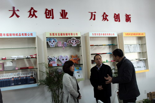 在二楼,甘校长来到外国语学院校企合作平台(PUE: Platform of University and Enterprise)创业实践区,看到学生正在利用平台忙碌地进行跨境电商作业,非常高兴。他对该院依托高校的智力和人力资源,以社会需求为导向,与企业共同构建人才合作培养机制,实现校企合作办学、合作育人、合作发展的模式表示肯定。