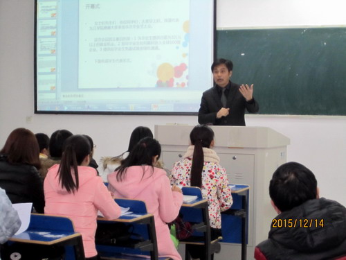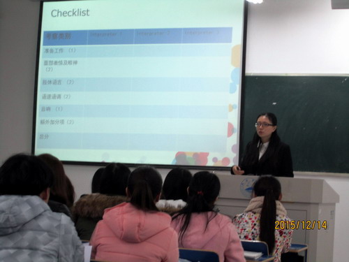 赵宋文老师采用PPT方式,讲授了“Public Speaking”内容。她通过实际案例,说明了对于口译者来说公共演讲技巧的重要性,影响公共演讲的因素,以及如何克服怯场等;通过分组方式,让学生到讲台上实际操练新闻播报,天气预报,公司产品介绍,开幕式讲话等内容,让其他学生充当评委,然后讨论各组的优点和不足。课堂上师生互动频繁,气氛活跃,很好地激发了学生学习兴趣,培养其合作精神和竞争意识。