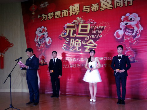 金龙腾跃、虎虎生风,晚会在精彩的舞龙舞狮及中华武术表演中拉开了序幕。八里湖校区管理办公室主任段宝斌致新年贺词。他代表八里湖校区管理办公室党政向辛勤耕耘、无私奉献的八里湖校区全体教职员工及莘莘学子表示新春的祝福!向关心与支持八里湖校区发展的各级领导及各部门、二级学院表示衷心的感谢!祝福大家新年快乐,阖家幸福!祝愿九江学院新的一年更加美好!祝福伟大祖国更加繁荣富强!