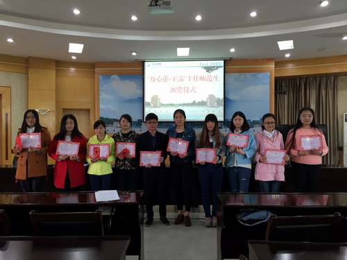 陶春元副校长首先向获得“万心蕙-王霈”十佳师范生的10位同学表示衷心的祝贺。他指出,奖学金的捐赠人万心蕙教授和她的丈夫王霈先生虽然已经先后谢世,但留给我们的最宝贵的精神遗产,就是她的爱国、怀乡、重史、尊师、勤俭、自立、无私。告诫学生要珍惜来之不易的学习机会。她说我们做这一点小小的事情, 也是为了抛砖引玉, 希望将来同学们,也为你们的老师, 你们的父母, 在你们能力所及的时候, 也来做同样的这种贡献。与其他职业相比,教师首先有着更高的个人品德要求,也就是师德。其次有着更高的知识要求,尤其随着现代社会的快速发展,网络信息发达,知识的来源非常丰富,作为当代教师一定要做到与时俱进,所谓“教师要有长流水,才能给予学生一碗水”。第三有着更高的教学能力要求,要有足够的技能水平和方法使学生接受知识。师范教育作为培养教师的专业教育也有更高的要求,正因如此,万心蕙教授及其丈夫王霈先生特别设立对师范生的专项奖励基金,以鼓励我校学生为振兴基础教育事业发奋努力。希望我校的各位师范生,特别是对于申请“万心蕙-王霈”奖学金的各位获奖者,更是要按照当代教师的要求塑造自己、自我要求、自我进步。希望各相关学院能进一步进行教学改革,提高师范专业教学水平,提高师范专业学生培养质量,为社会培养出合格的师资。