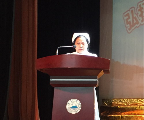 学生代表A1311班戎梦迪代表全院学生向工作在一线的护理前辈们表示了崇高的敬意,并向传道授业的老师们表示了衷心的感谢;在发言中,她勉励学弟学妹们现在要做一个出色的学生,将来要做一名优秀的护士,不辜负学校及老师的殷切期望,用实际行动弘扬南丁格尔精神。