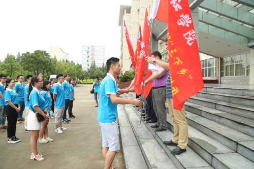 仪式上,王副校长等领导为社会实践服务团授旗。各服务团队接过这象征着责任、义务、热情的队旗与学校领导、带队老师分别合影留念,记录下这激动人心的时刻。校团委书记闫来英对三下乡社会实践队作了具体要求。校团委副书记赵宇剑宣读了“三下乡”具体内容和日程安排,学员代表江春莲同学作了表态发言。