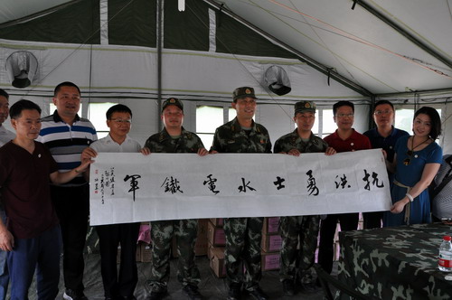 随后,民盟慰问团一行还向武警水电部队赠送了由民盟省直出版文化支部陶金华的“抗洪勇士 水电铁军”书法作品,以此表达对武警水电部队奋力抗洪抢险保卫家园的永恒敬意。