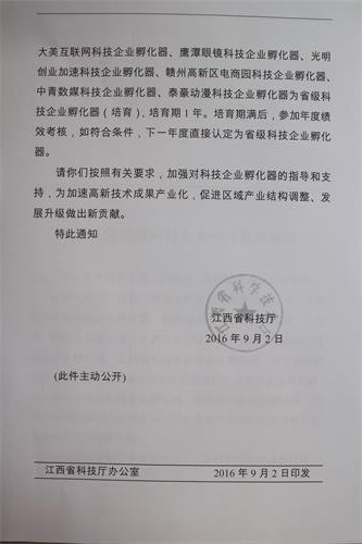 日前,从江西省科技厅公布的《关于认定省级科技企业孵化器的通知》(赣科高发字[2016]134号)获悉,我校大学科技园获批省级科技企业孵化器。这是继我校大学科技园2015年12月由江西省科技厅、江西省教育厅联署认定为省级大学科技园以来又一个省级荣誉。