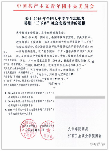 近日,团中央公布了2016年全国大中专学生志愿者暑期“三下乡”社会实践活动优秀单位、团队、个人名单和2016年大中专学生“三下乡”社会实践“千校千项”成果遴选结果。我校荣获2016年全国暑期三下乡社会实践优秀单位等多项荣誉。