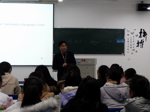 熊丽老师采用PPT方式,讲授内容为My Forever Valentine。课堂上熊老师授课生动,中西文化差异娓娓道来,师生互动频繁,气氛活跃,很好地激发了学生学习兴趣。杨耀防副校长自始至终专注听课,并认真做听课记录。