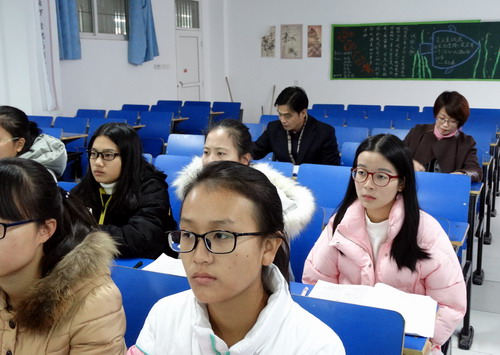 12月23日上午,杨耀防副校长到香远楼402教室,同外语A1612同学一起听了外国语学院熊丽老师讲授的《基础英语(上)》课程。外国语学院院长韩琨一同听课。