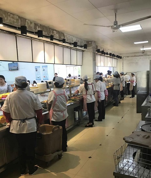 忙完早餐后8:10,工人师傅们稍事休息,开始享用“丰盛的早餐”——剩饭剩菜。食堂的工人师傅们每餐都在我们全校师生吃过之后,剩什么就吃什么,从来没有人抱怨。吃过简单的早餐,他们马上又投入准备中餐的工作中。把各种蔬菜、荤菜准备就绪,到10:30点左右,厨房里就成了决战时刻的战场。大厨手持炒锅,在炉灶边烈焰熊熊,不断翻腾,一锅又一锅的菜肴随之烹饪出锅。每天,食堂的大厨要炒30~40种菜品,尤其在夏天高温季节,灶台前气温高达七、八十度,每每下灶时,人好象从水中捞出来似的,汗水渗透衣襟,如此辛苦地工作,没有好身体,根本无法完成这些基本任务。面点师想方设法制作精美糕点面食,符合就餐者的口味。冬天配送中心洗菜的水温零下3~4度,每天人工都要洗5~6千斤蔬菜,可想其工作的辛苦。