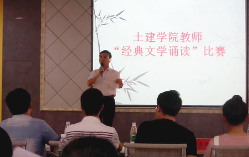 为弘扬中华民族优秀传统文化,提高土建学院教师人文素质,陶冶教师思想情操,推动学院文化建设,5月17日下午,土建学院在望庐楼101会议室举办了全院教职工经典文学作品诵读比赛。土建学院近100名教职工参加了本次比赛。校党委副书记魏立平到场观看了比赛。