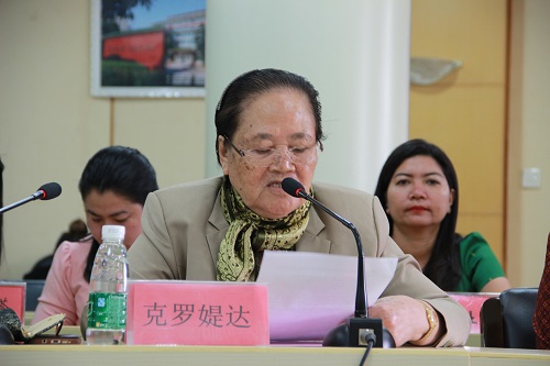 柬埔寨王家研究院院长克洛媞达院士做了热情洋溢的致辞。她说,回顾历史可知道中柬友好交往可追溯到两千年以前,在当今两国领导人的共同努力下,双方达成了全面战略合作伙伴关系,促进了两国人民心心相通。接着她对九江学院一直以来对柬埔寨王家研究院的支持与帮助表示感激,并回顾了双方合作建立的柬埔寨王家研究院孔子学院近年来取得的丰硕成果。最后,克洛媞达院士再一次对九江学院领导和师生的热情款待表示感谢。