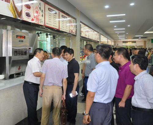 调研组一行在实地调研中,首先听取了夏副校长关于我校强化食品安全工作总体思路和做法,接着前往我校最大、就餐保障人数最多的学生三食堂实地调研。姜处长和蔡主任向调研组一行就我校食品安全机制体制保障、食品源头采购安全把控、ISO9001标准化操作、洁厨亮灶展示系统建设、自动售饭机等自动化信息化设备运行情况等多方面做了详细汇报。