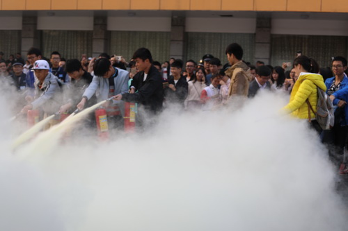 演习结束后,王万山副校与同学们一起用灭火器进行了灭火演练。