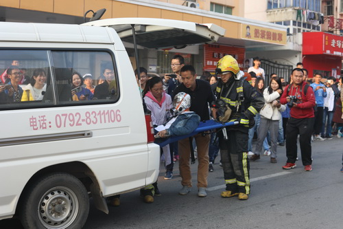 与此同时,接到“报警”的市消防支队消防车和救护车也已到达了“火灾现场”。两名消防队员佩戴空气呼吸器冲进“火场”搜救被困人员,用担架抬着“被困受伤人员”送至救护车上;其它消防战士则紧张有序地进行“灭火”的准备,并进行“灭火”操作直至彻底压制住“火势”。