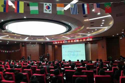 11月30日,由校团委主办的第一届模拟联合国大会开幕式在我校逸夫报告厅举办。校党委副书记魏立平出席开幕式并讲话。学生处、校团委、外国语学院负责人及19支代表队和留学生代表、外语爱好者共计200余人参加了开幕式。