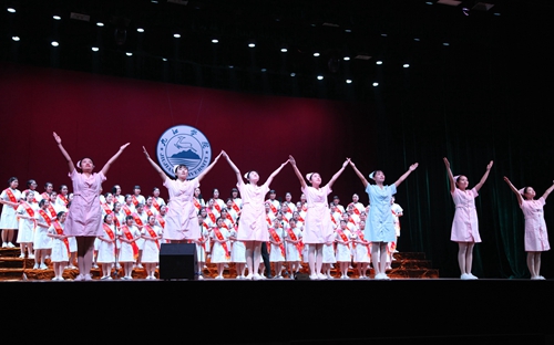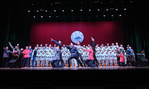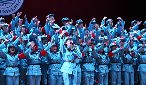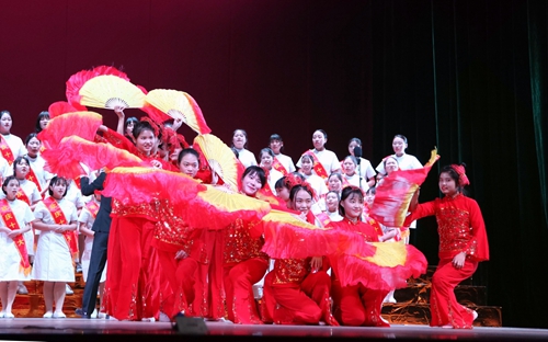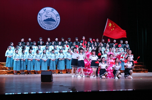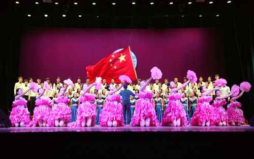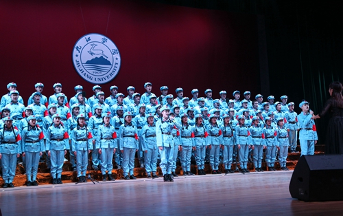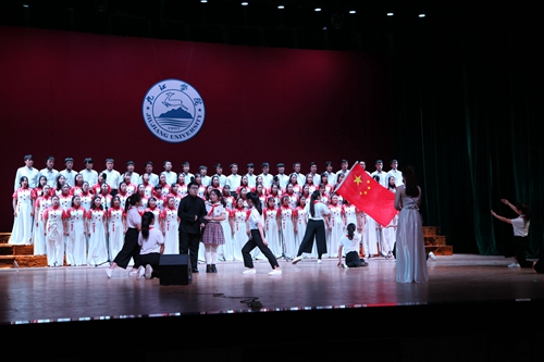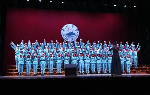 10个学院参赛队唱响了《迎风飘扬的旗》和《走向复兴》《以人民的名义》《歌唱祖国》等颂党颂祖国歌曲,雄浑嘹亮的歌声唱出了青年学子的民族精神与爱国情怀,唱响了共产党好、伟大祖国好和社会主义好的主旋律。校工会教师代表和职工子女带来了《我和我的祖国》表演唱,艺术学院交响乐团表演了《长征组歌》选曲。在昂扬有力的乐曲声中,队员精神饱满、充满激情、意气奋发,合唱队伍声音洪亮,合唱形式新颖多样,充分展现了师生的良好精神风貌。