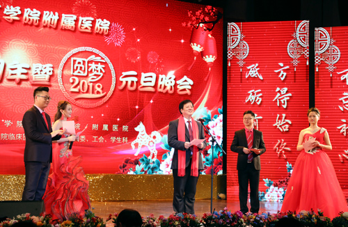 张志平院长代表临床医学院/附属医院党政班子致新年贺词,他说,翻开140年绵长而厚重的历史,一代代附院人呕心沥血,赢得了患者的信赖和医界的认可。今天,我们的医院已是今非昔比、旧貌新颜,医教研齐头并进,各院区协调发展,社会效益和经济效益同步快速增长,大型三级甲等现代化综合医院的大格局已然形成。新门诊综合大楼9月份顺利封顶,2018年即将投入使用;150亩的医养新区建设也将全面启动。2018年,面对新的机遇和挑战,我们将倍加珍惜广阔的发展平台,始终坚持医教研并举,全面深化医疗改革,持续加强教学工作,不断推进学科建设,硬件建设不松懈,软件建设再提升,努力推动各项工作实现新的更大突破!