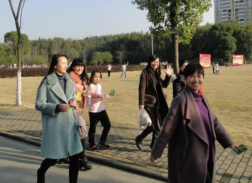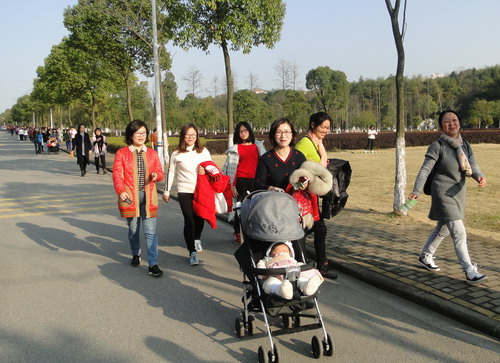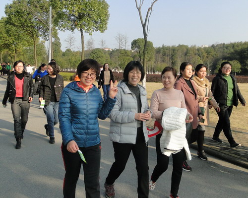 在明媚的春光中,700多名女教职工健走队伍浩浩荡荡沿着校园环行。矫健的身影为校园增添了一道亮丽的风景线,她们带着愉快的心情享受着春天的美景。健走途中,有的快步走,有的人结伴而行、有说有笑,还有的推着婴儿车慢走……大家边走边欣赏着沿途风景,身着的红色和蓝色等各色运动服在校园里汇成了一道靓丽的风景线,人与自然融为一体。