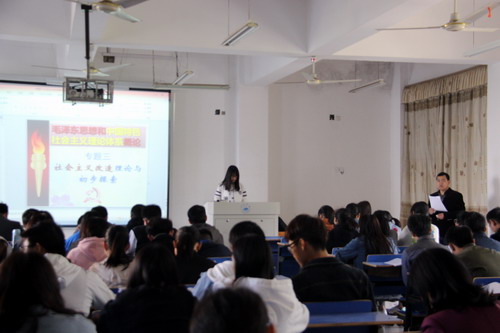 在望庐楼302教室,马克思主义学院赵文老师的课程从学生讲述近期新闻热点开始,其他同学对新闻讲述进行了点评,赵文老师进行了小结。随后,赵文老师对“新民主主义革命”内容进行了讲述,以丰富的视频资料、历史案例深入浅出的讲解了新民主主义革命的性质、基本特征及历史地位。