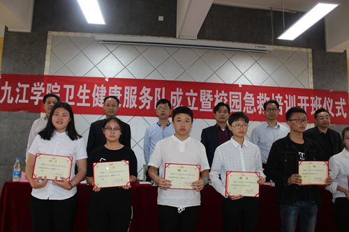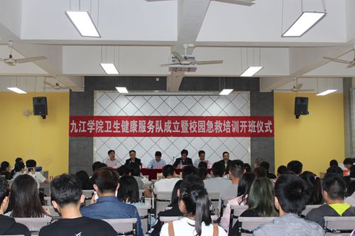 为了更广泛地在校园内开展和普及应急救护知识与技能培训工作,切实提高我校师生的安全防范意识、防灾避险和自救互救能力,4月12日下午,在学生处、团委、保卫处的支持与配合下,由校医院组织的“校园卫生健康服务队成立暨急救员培训班”开班了。杨耀防副校长到会并讲话,九江市红十字会石金平主任、九江市红十字会救护培训部钱昌琪主任,保卫处张晓明处长、学工部范宇航副部长、校医院贾宗林院长等参加了此次开班仪式,仪式由校医院贾宗林院长主持。