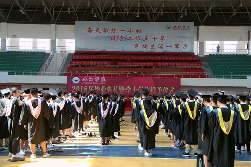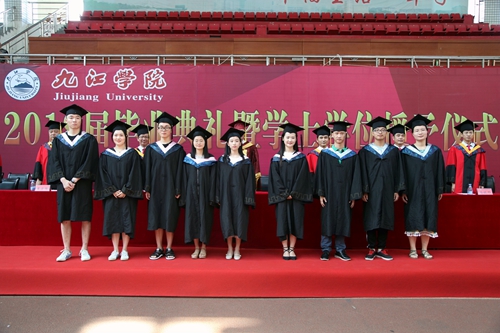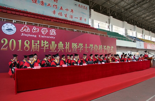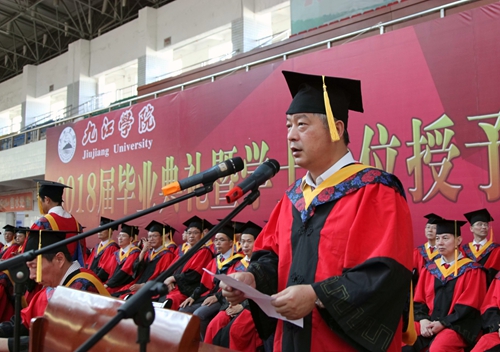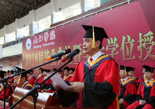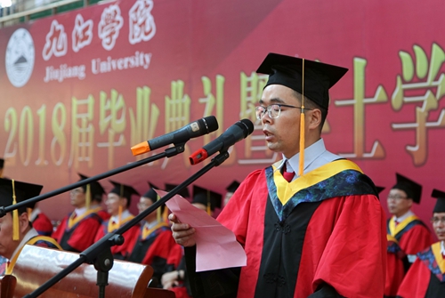 毕业典礼上,九江学院2017年度“大学生年度人物、校十佳大学生、叔子爱莲奖学金获得者电子工程学院A1441班温乔峰同学代表2018届毕业生发言时感恩母校、感谢恩师、感谢父母。他说,九江学院是我成就实现梦想的地方,在这四年里,我们获得了能力的锻炼,明确了未来的目标;树立了正确的世界观、人生观和价值观。我们将始终铭记“竞知向学厚德笃行”的校训,在实践中检验自我,发现真知,衷心祝愿我们的母校明天更加美好!
