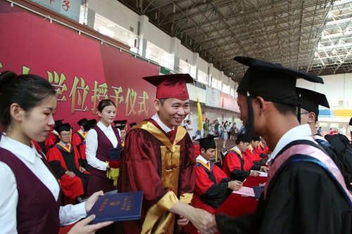 校党委书记赵伟为优秀毕业生代表颁发了毕业证书,全体校领导为毕业生代表拨流苏。