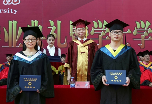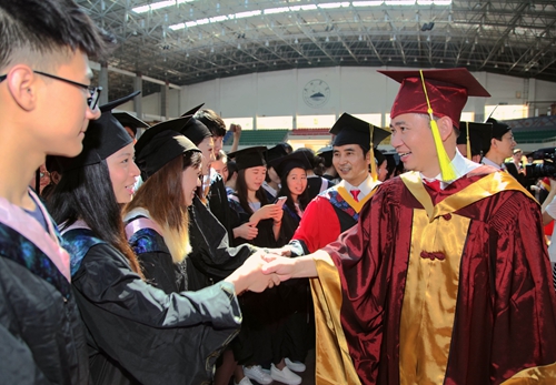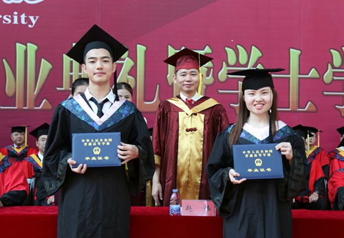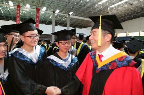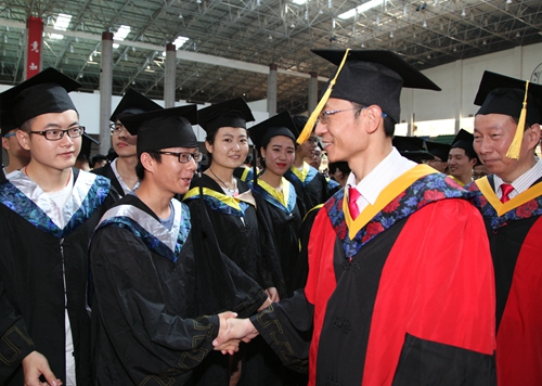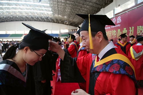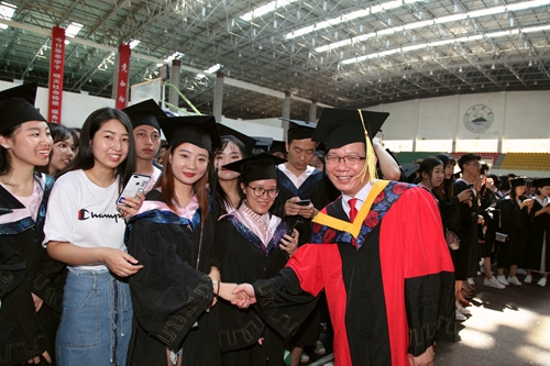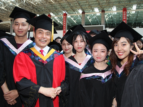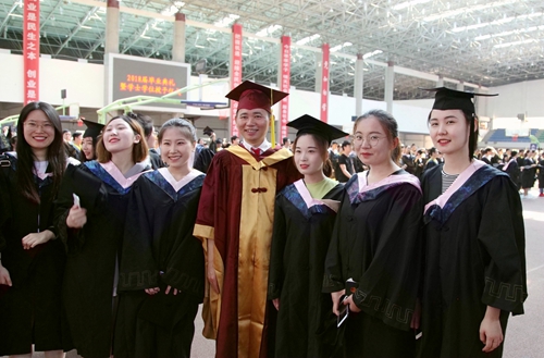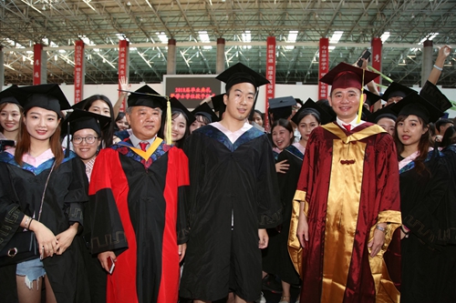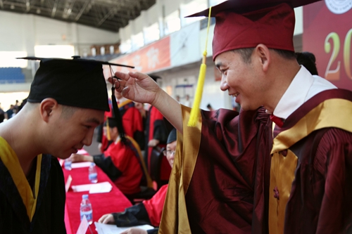 毕业典礼上,与会的校领导、校学位评定委员会委员和各二级学院党委书记、院长来到同学们当中,一一为每位毕业生扶正学士帽流苏并合影留念。