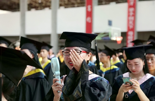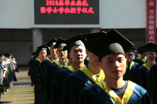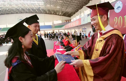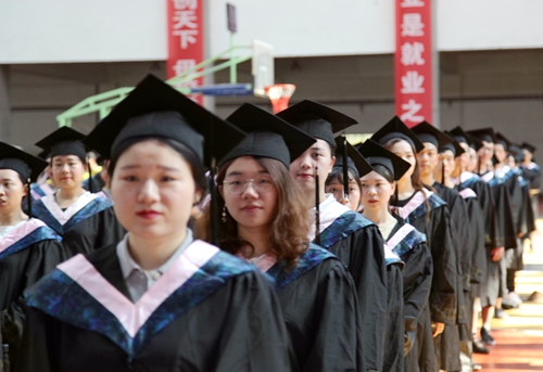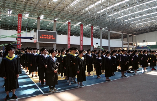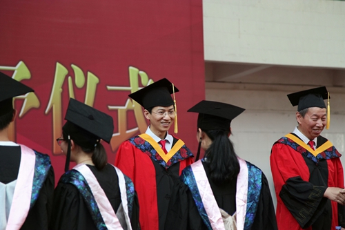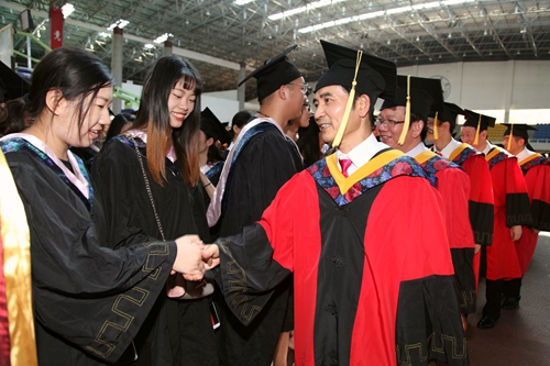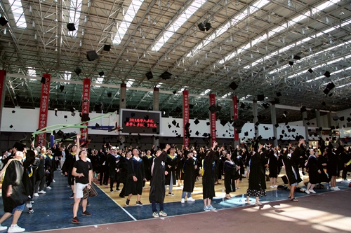 在激昂的歌声中,与会的全体校领导、校学位委员会委员和各二学院领导向全体毕业生挥手致意,满含着欣慰与不舍,欢送2018届毕业生走向新的人生舞台。
