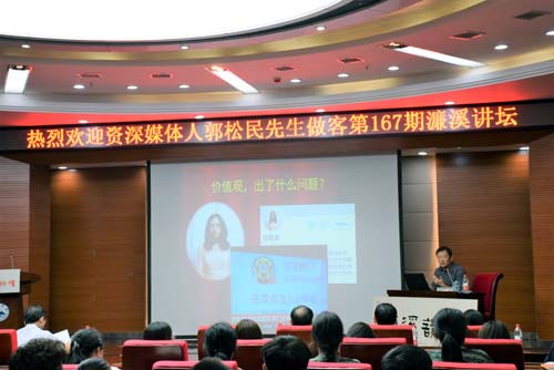 9月10日晚,资深媒体人,昆仑策研究院高级研究员,中国社会科学院国家文化安全与意识形态建设中心特约研究员郭松民先生应邀做客我校第167期濂溪讲坛,在逸夫图书馆学术报告厅作了题为“当代文化现象与核心价值观问题”的讲座。讲座由党委副书记魏立平主持。