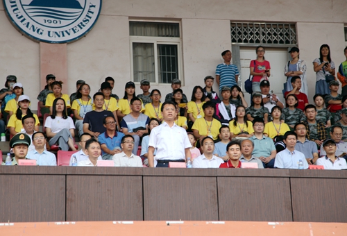 金秋送爽,丹桂飘香。9月16日上午,我校2018级新生军训总结表彰大会暨开学典礼分别在主校区和浔东校区隆重举行。武警九江支队副支队长郭华,在家校领导赵伟、刘晓东、魏立平、纪岗昌、陈春生、杨耀防、夏启国、查振华、李广欣出席了本次会议,各二级学院院长、党委书记以及有关职能部门负责人、全体辅导员、新生班主任及主校区、浔东校区、八里湖校区2018级近万名新生参加了本次大会。军训总结表彰大会由陈春生副校长主持。