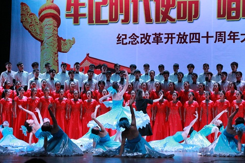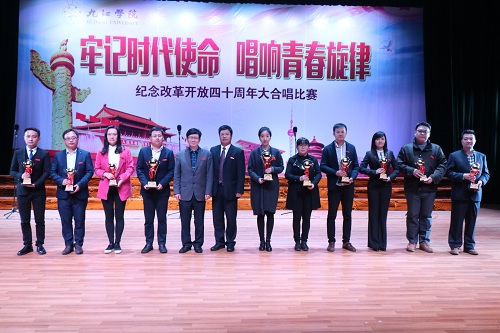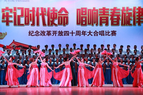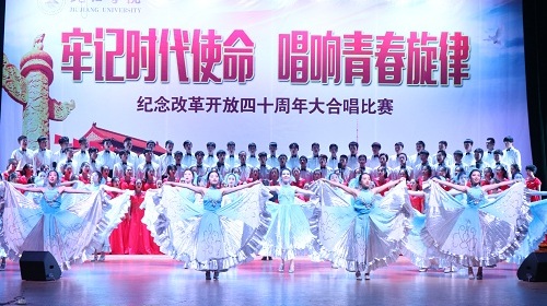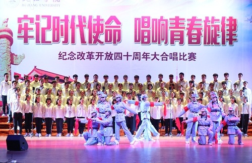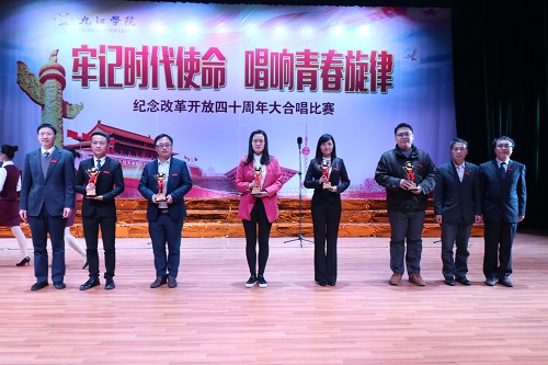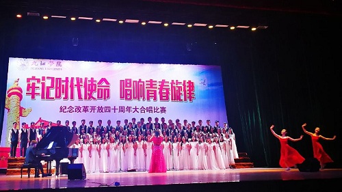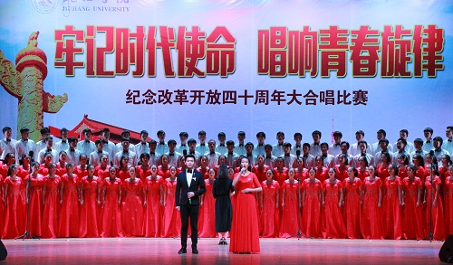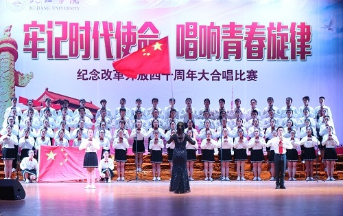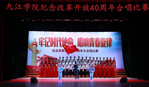 歌唱祖国,歌唱新时代。11月6日晚,校大礼堂传出阵阵歌声,时而慷慨激昂,时而温柔深情。九江学院“牢记时代使命 唱响青春旋律”纪念改革开放40周年合唱比赛在此隆重举行,用歌声赞美改革开放40年来取得的辉煌成就,展示九院学子的风采。全校19个学院全部参加了比赛,共有10支队伍进入决赛。副校长王万山、陈春生出席活动。有关职能部门负责人、各二级学院党委书记和学生1100余人观看了比赛。