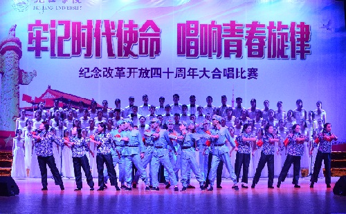 各院学子歌声高亢嘹亮,他们誓要唱响风华正茂的岁月,更要直抒对祖国的深深热爱。每支合唱队风格各具特点,服饰或素如白衫青衣,或艳如红裙金带;点缀或霓裳曼舞,或铿锵诵读,或金戈铁马。大家怀着对祖国的挚爱,怀着对改革开放的深厚情感,尽情歌颂伟大祖国铸就辉煌的40年,歌颂学校跨越腾飞的奋斗历程,比赛现场高潮此起彼伏。