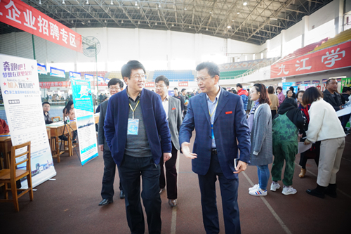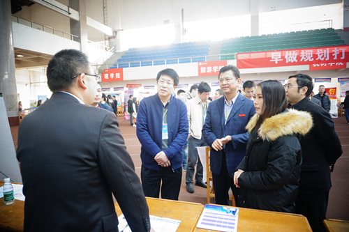 省高等院校毕业生就业工作办公室主任陈学军在校领导刘晓东、王万山、陈春生、夏启国的陪同下到现场视察指导,与用人单位招聘负责人和毕业生进行亲切交流,并就用人单位的人才需求、校企人才培养对接等方面交换了意见。