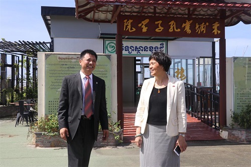 国务院参事许琳一行在柴克清院长的陪同下参观了柬埔寨孔子学院,对柬埔寨孔子学院从无到有、从少到多的软硬件建设表示欣慰和认可,并表示,柬埔寨孔子学院这九年来取得了令人瞩目的成绩,要继续努力,再创辉煌!