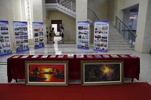 文化节的现场,柬埔寨学生搭建的具有柬埔寨特色的茅屋,制作的手工艺品以及摆放的传统服饰洋,使整个展厅洋溢着浓浓的柬埔寨文化风情。陈列厅里展示了柬埔寨孔子学院成立十周年的成果:柬埔寨皇家科学院孔子学院成立十周年图片展,全面展示了中柬合作共建的柬埔寨皇家科学院孔子学院十年来,从无到有,从小到大,从弱到强的发展历程;孔子学院翻译出版的书籍,吸引了众多学者和师生们驻足浏览。