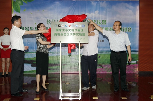 在热烈的掌声中,江西省人大原副主任、省人民政府原副省长、江西生态文明研究促进会理事长胡振鹏教授,江西省生态文明办专职副主任刘兵,九江市副市长李军,九江学院党委书记、江西长江经济带研究院院长赵伟等共同为国家生态文明试验区高校生态文明研究联盟揭牌。