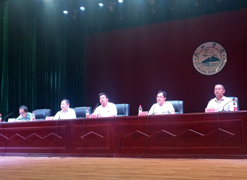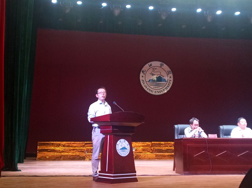 大会在雄壮的国歌声中拉开序幕。陈春生发表热情洋溢的讲话,深情寄语新生。陈春生说,大学是一个崭新的开始,同学们一定要学会自我管理,完善自我,超越自我,意识到自己肩负的责任,把个人的发展与民族的前途命运紧密联系在一起,珍惜时间,发奋学习。陈春生将郭沫若的诗句“我是一条天狗,我把月来吞,我把日来吞,把一切的星球来吞,把全宇宙来吞”赠予新生,希望同学们借助九江学院这一方舞台,书写出年轻人的豪迈与自信。